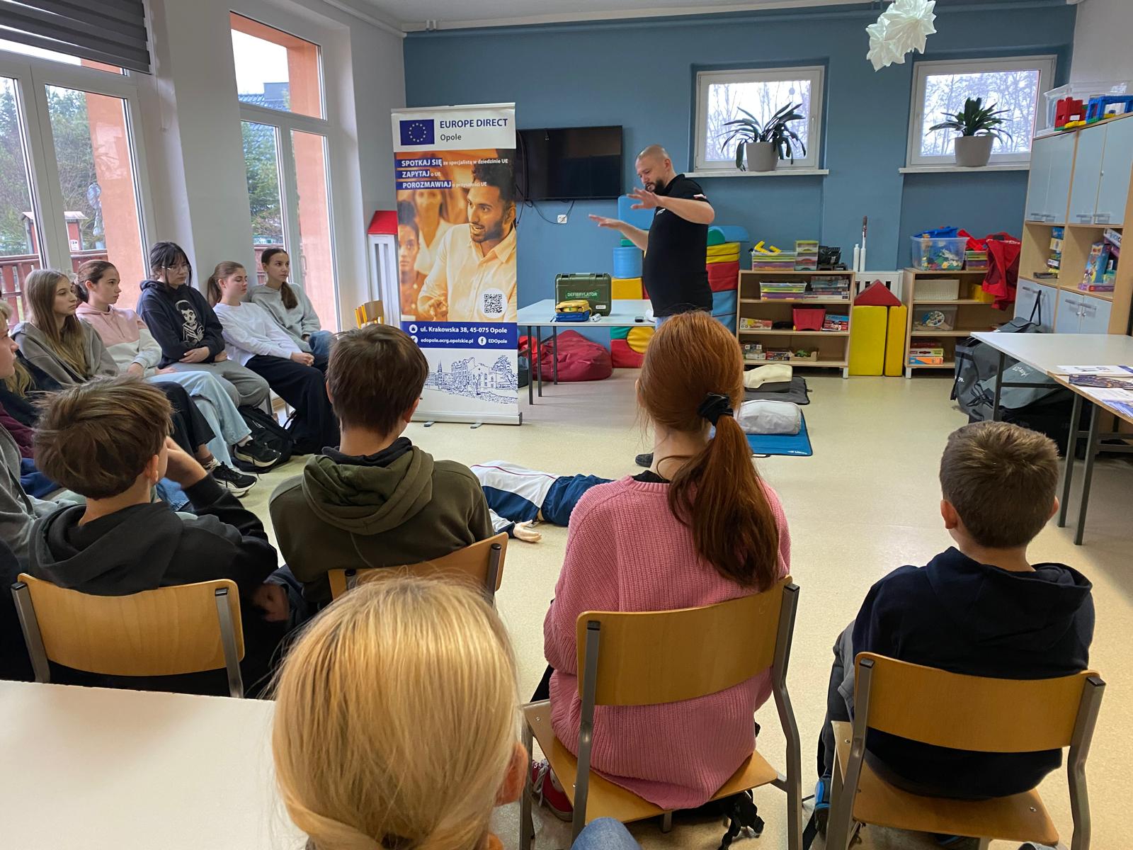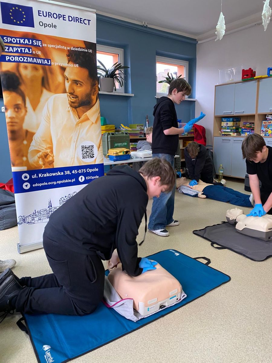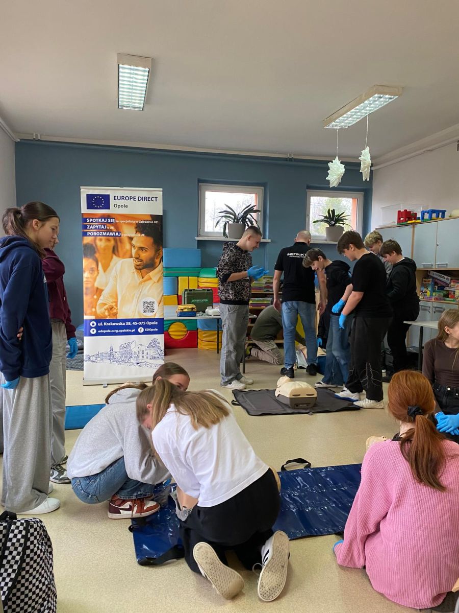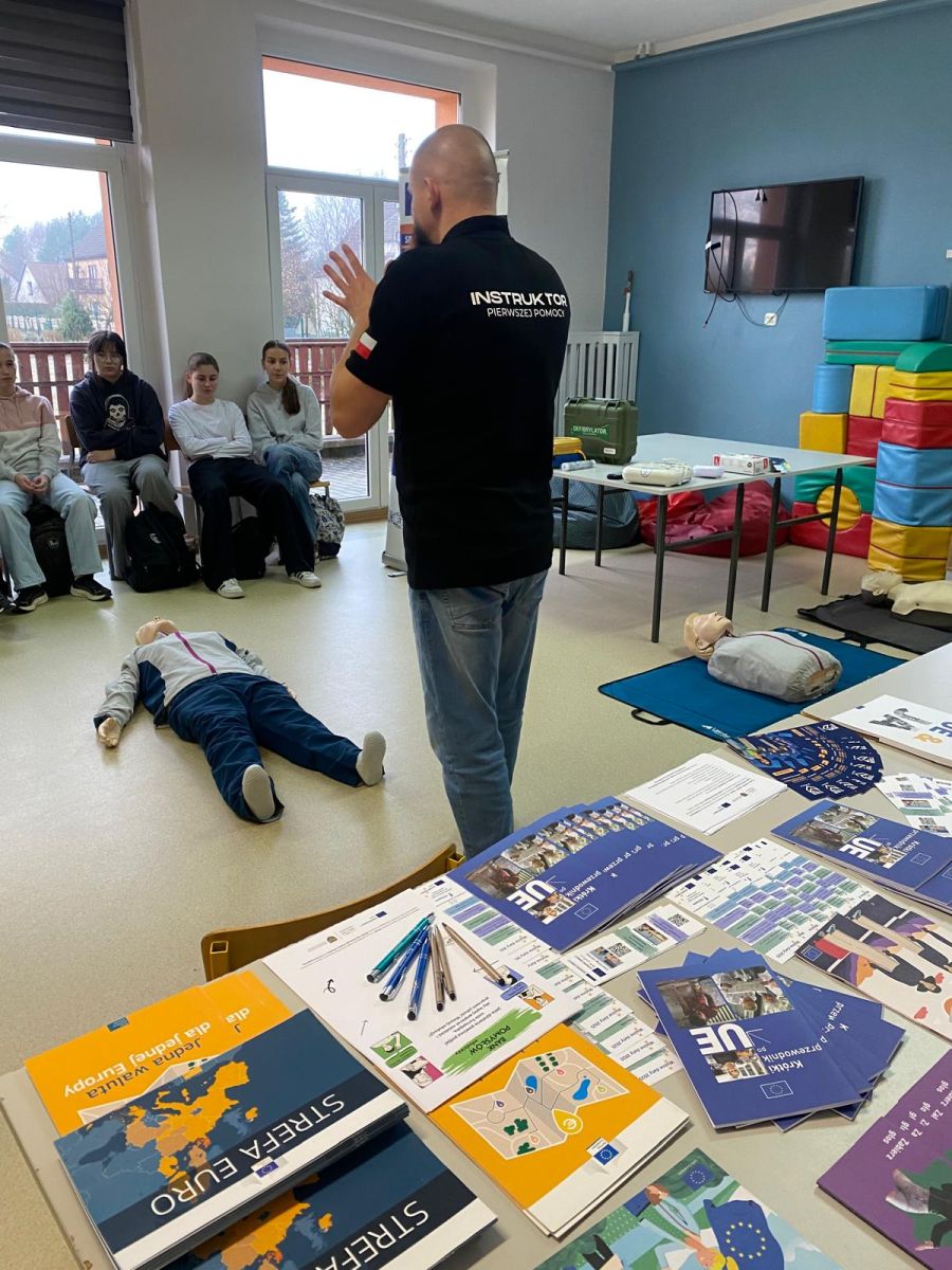 Nasi uczniowie kl. VII i VIII w ramach Europejskiej Akademii Umiejętności wzięli udział w zajęciach teoretycznych i praktycznych z udzielania pierwszej pomocy przedmedycznej. Szkolenie poprowadził Pan Piotr Kozieł- pedagog specjalny, nauczyciel, ratownik OSP i PCK, instruktor pierwszej pomocy, dowódca specjalistycznych zespołów poszukiwawczo - ratowniczych OPOLSAR, student ratownictwa medycznego.