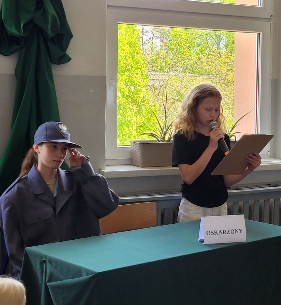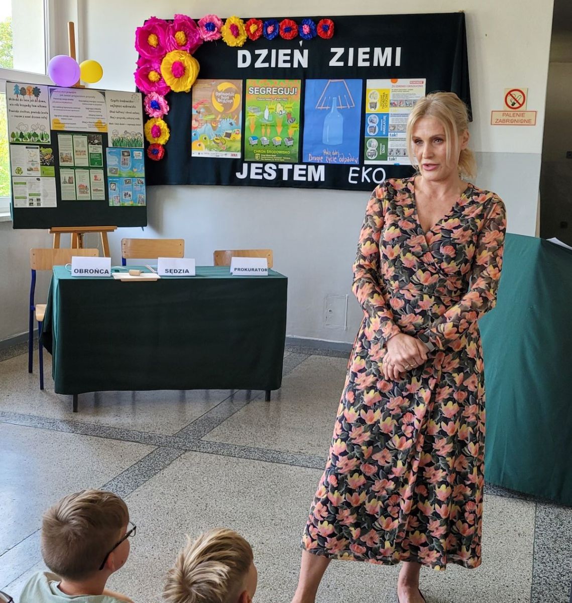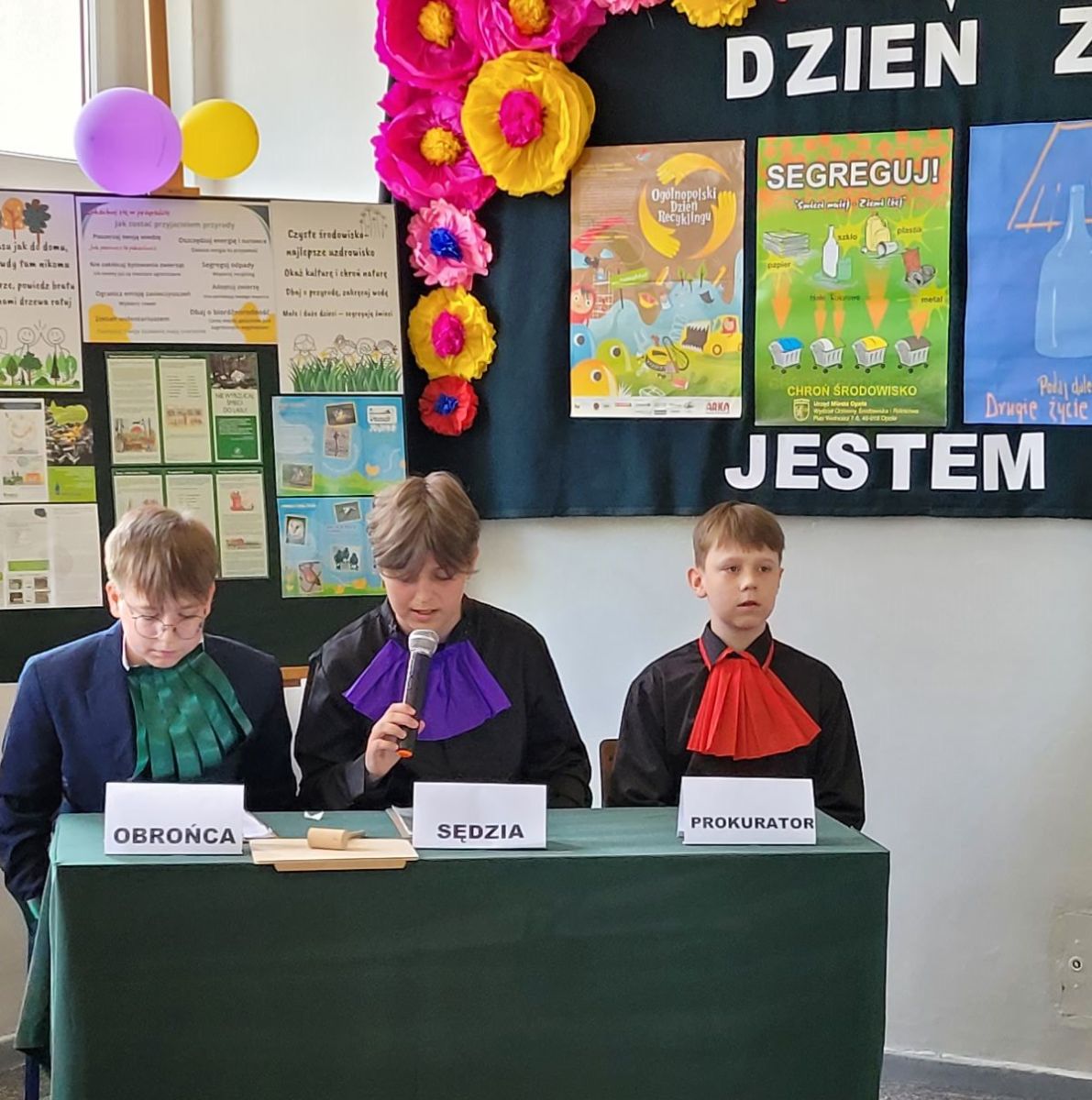 W tym roku uczniowie klasy 6 z okazji Dnia Ziemi przygotowali przedstawienie . Był to sąd nad mieszkańcem , który działał na niekorzyść przyrody wyrzucając do lasu zużyty sprzęt elektryczny i elektroniczny- ZSEE.